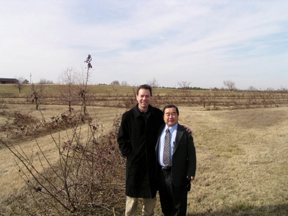 2004年 アメリカ・アーカンソー大学を初めて訪問し、クラーク博士と交流を深めました。そのご縁を通じて、日本へのブラックベリー苗木導入契約の締結へとつながりました。