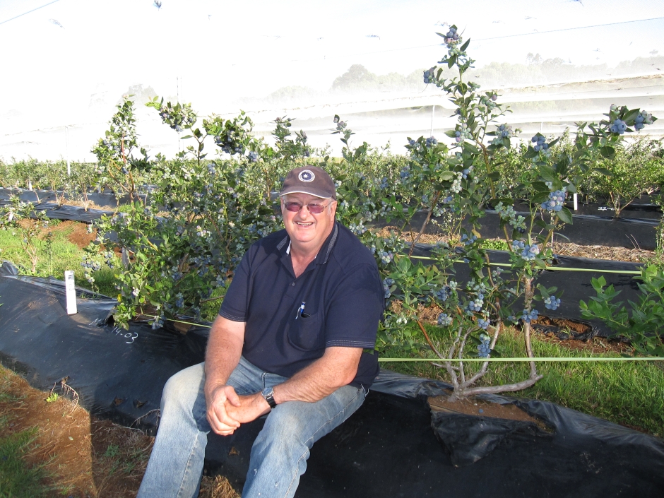 2011年 オーストラリア・MBO社を訪問。ベル氏より、開発品種「ユーリカ」について、同品種の樹を背にその魅力をご紹介いただきました。